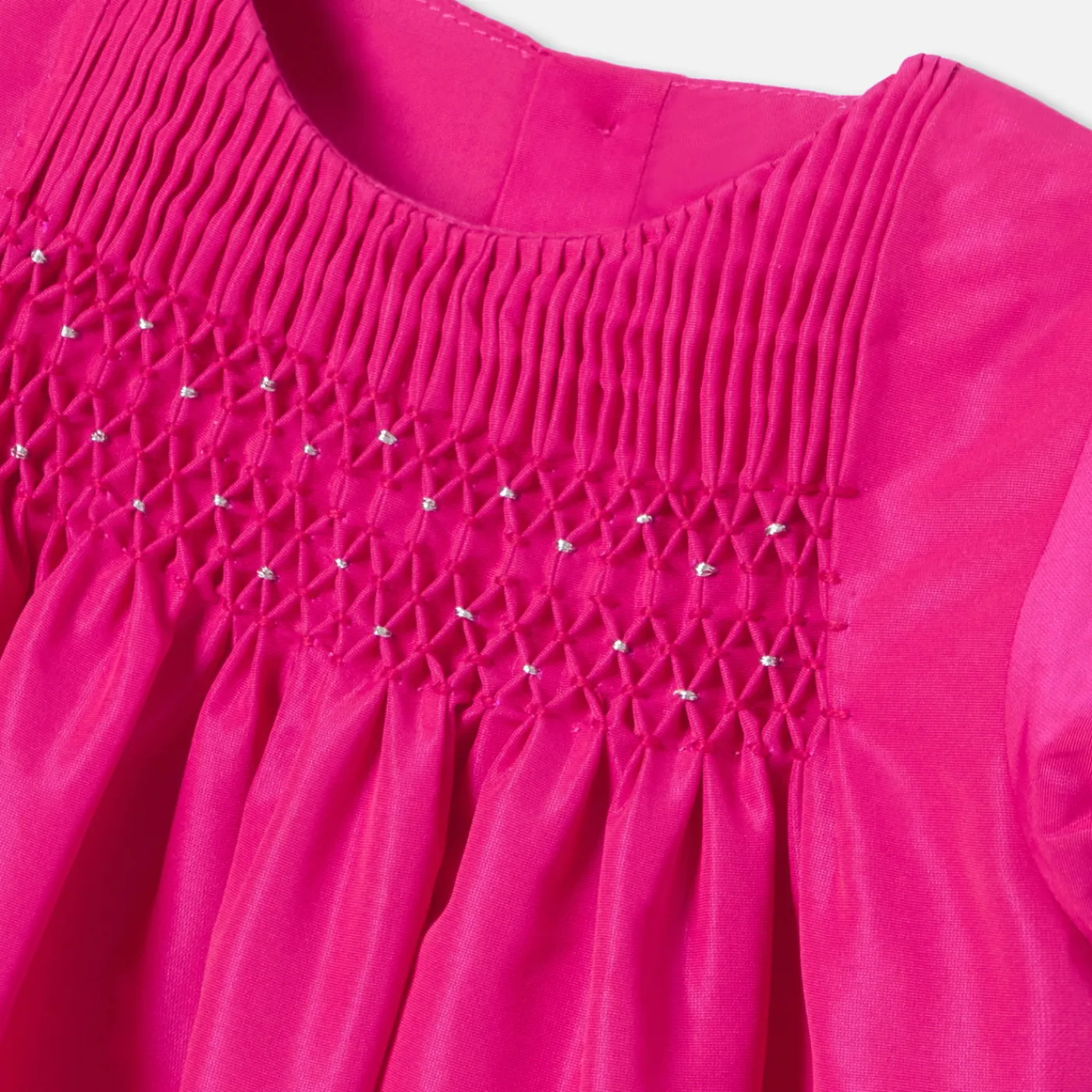 This baby girl dress is a sign of colorful elegance for the festive season. Made from taffeta, with silver smocking on t…