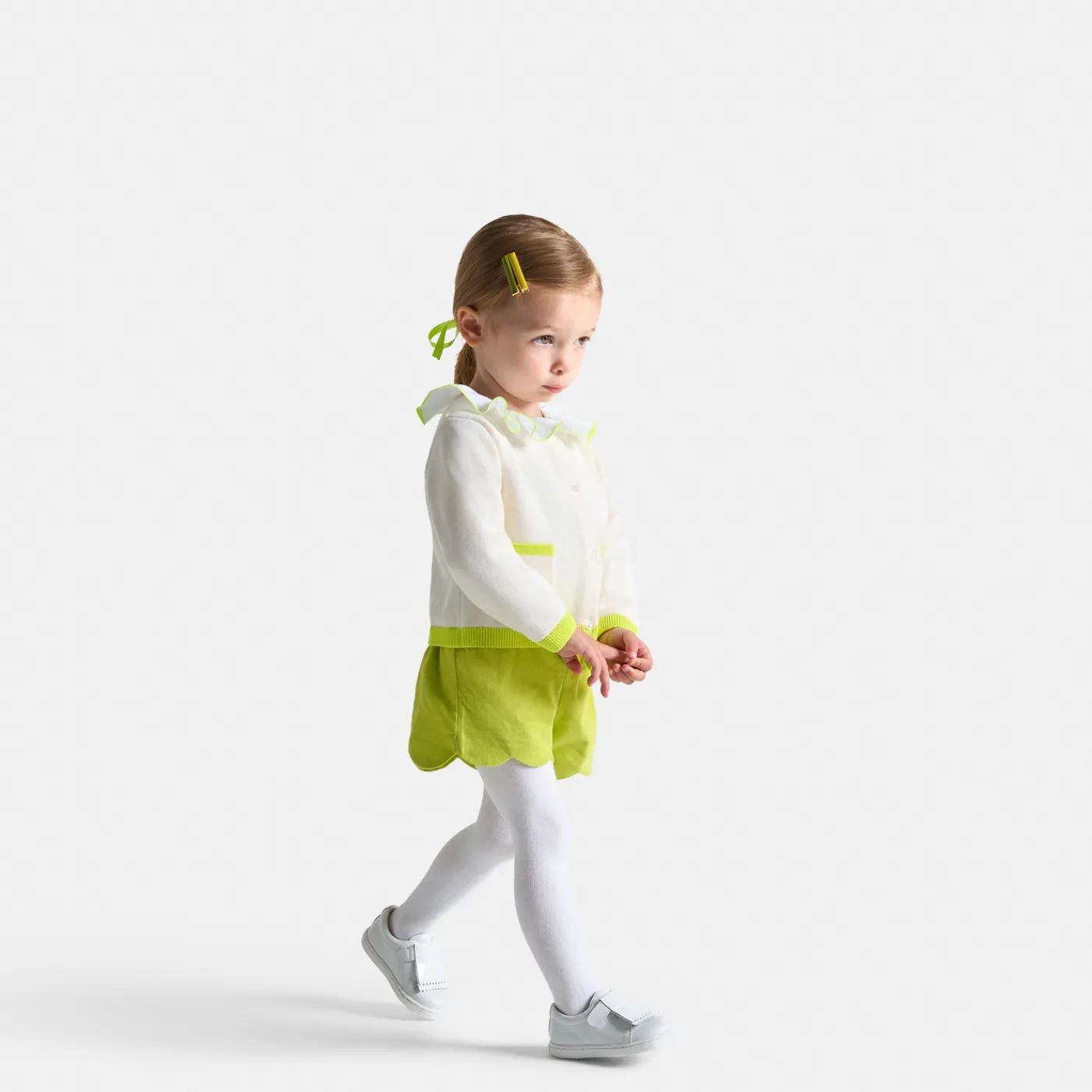 A chic, modern winter with these baby girl shorts. Available in white or acid yellow velvet, the pretty scallops and sil…