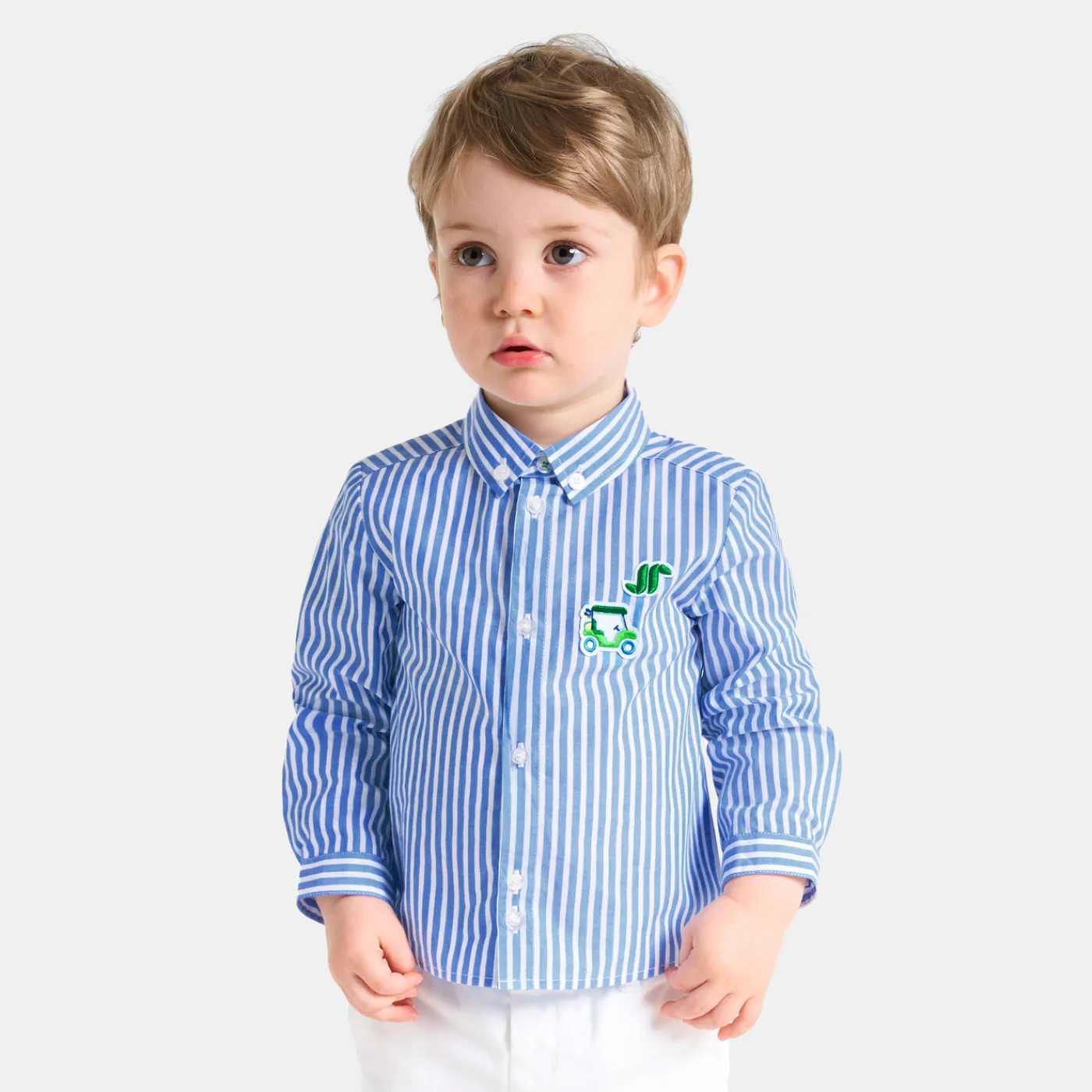 Worn open over a printed t-shirt with rolled-up twill pants, the baby boy shirt is available in organic cotton for back-…