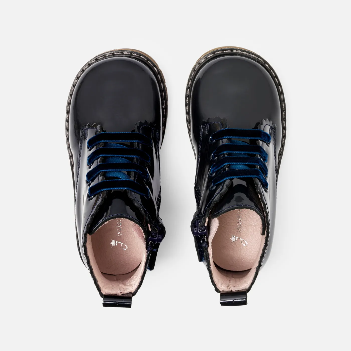Inspired by the British wardrobe, with their notched soles for an assertive character, these baby girl ankle boots are modernized by navy or pop pink patent leather. Easy to slip on, pair them with a blouse and velvet shorts for back-to-school.