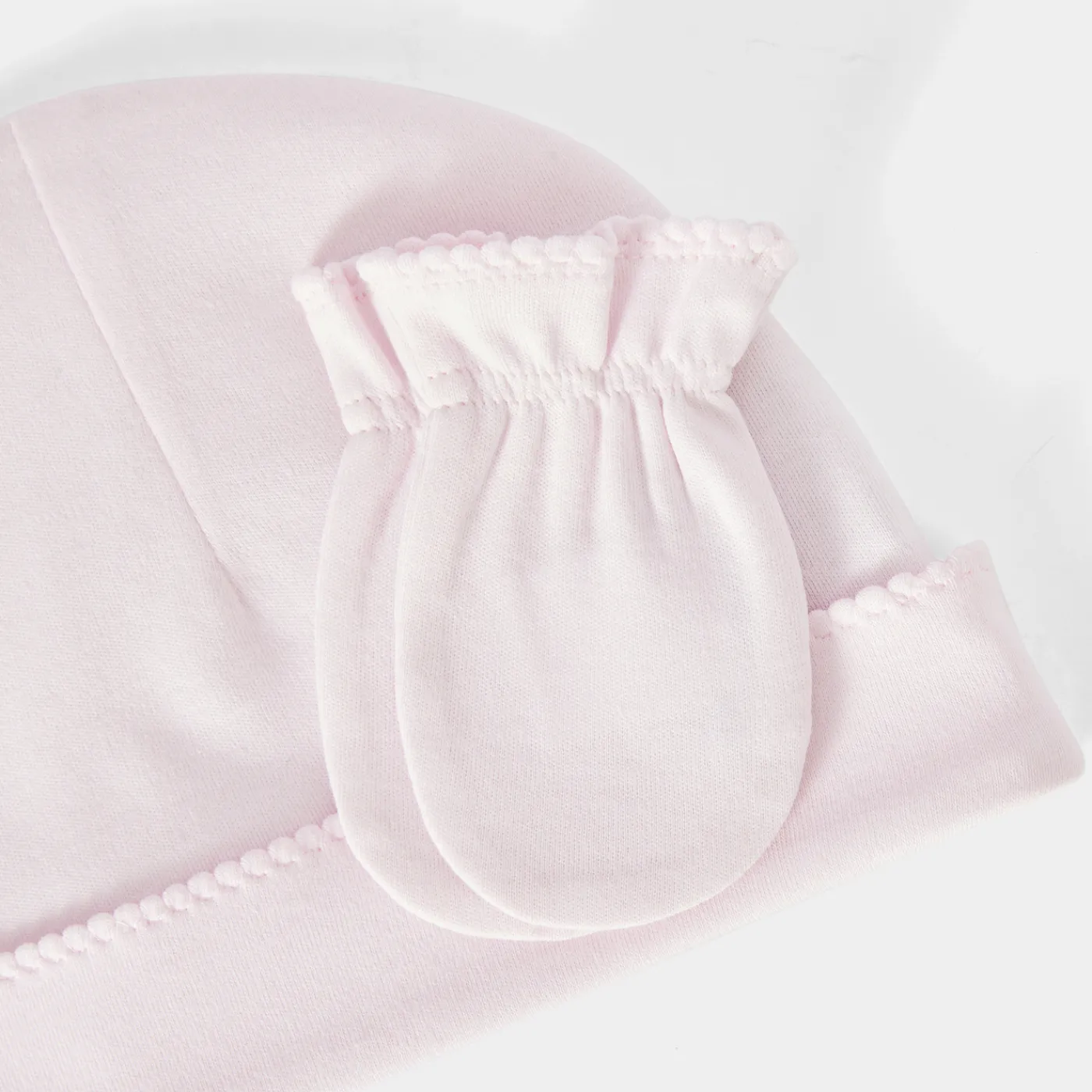 Combining a bonnet and matching mittens, this birth set features the softness of a supple organic cotton knit. A must-ha…
