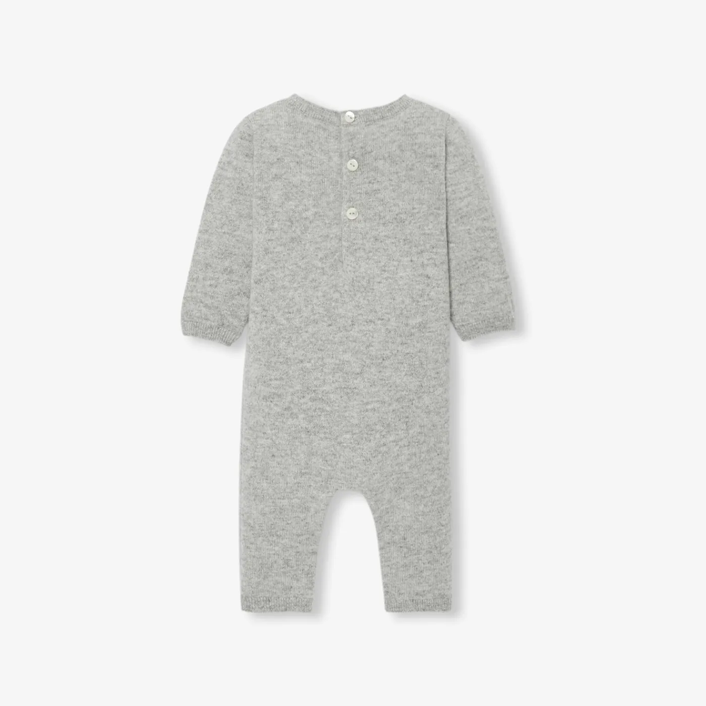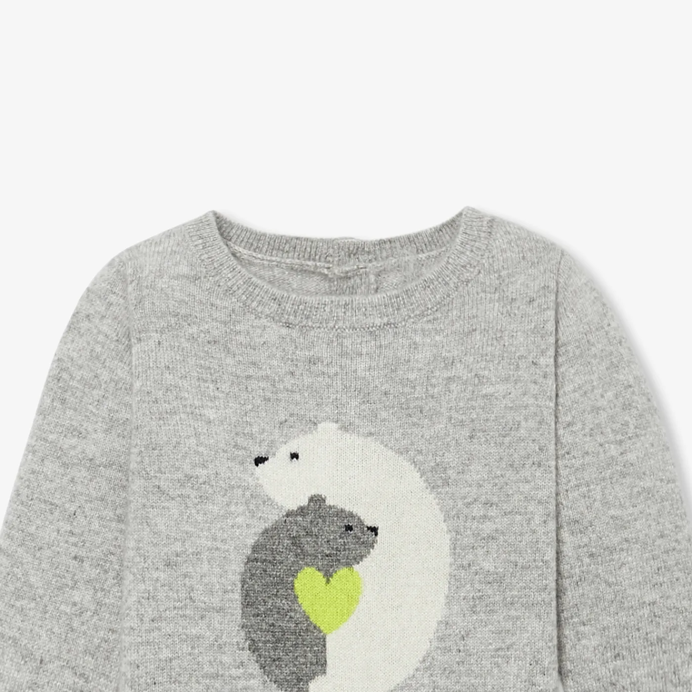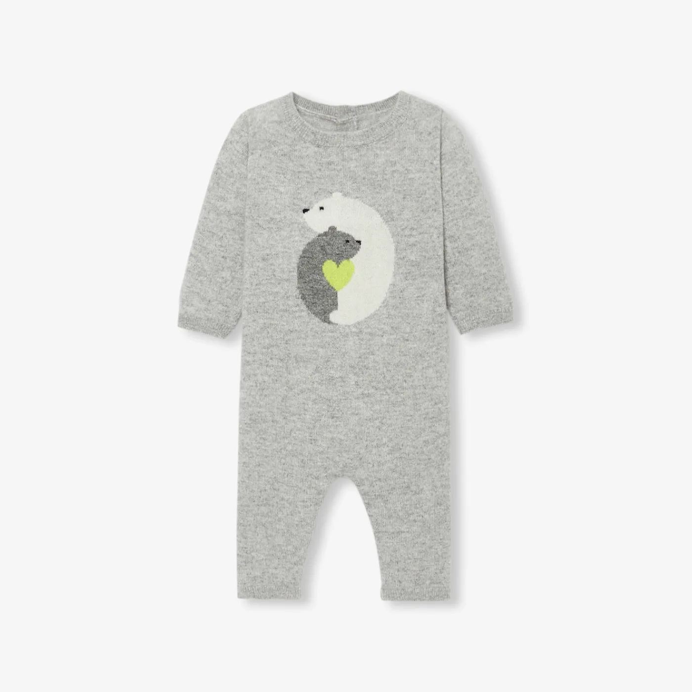 A baby jumpsuit with clean lines and soft colors for a chic, cozy winter. Animated by little bears cuddling in Intarsia …