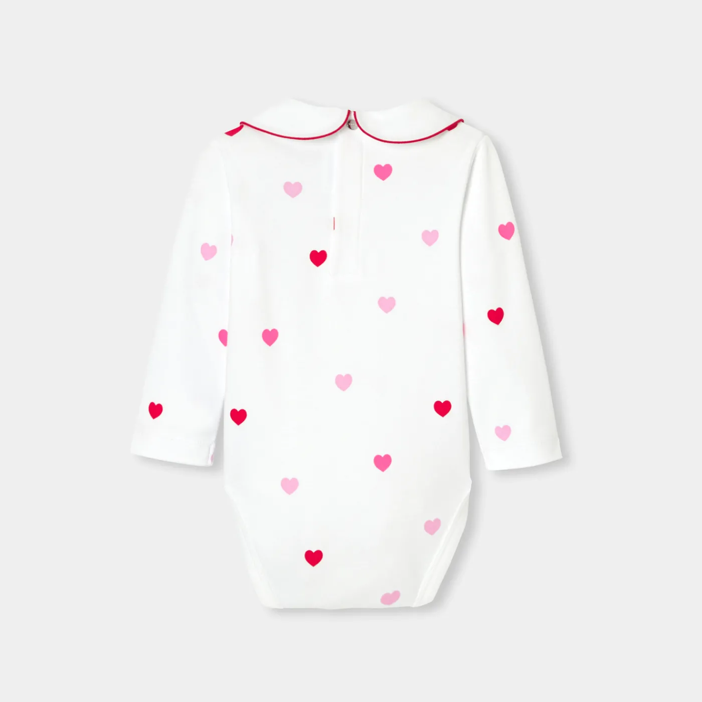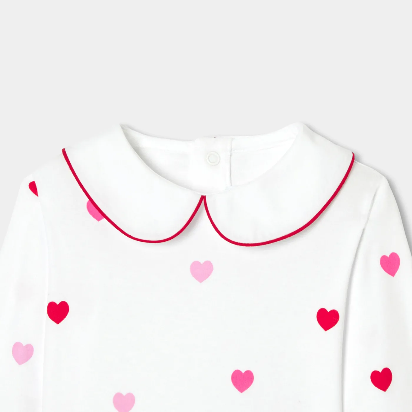 A joyful season full of tenderness with this baby girl bodysuit. Embellished with hearts and a Peter Pan collar with con…