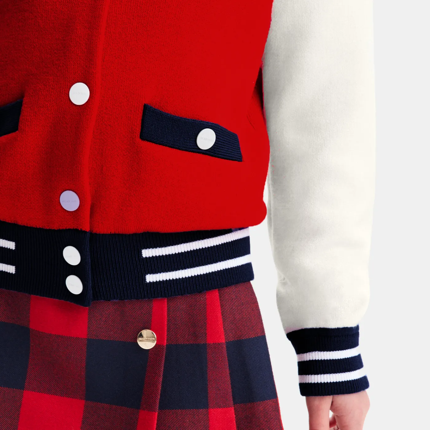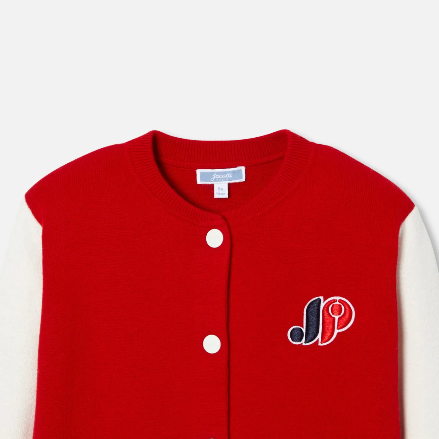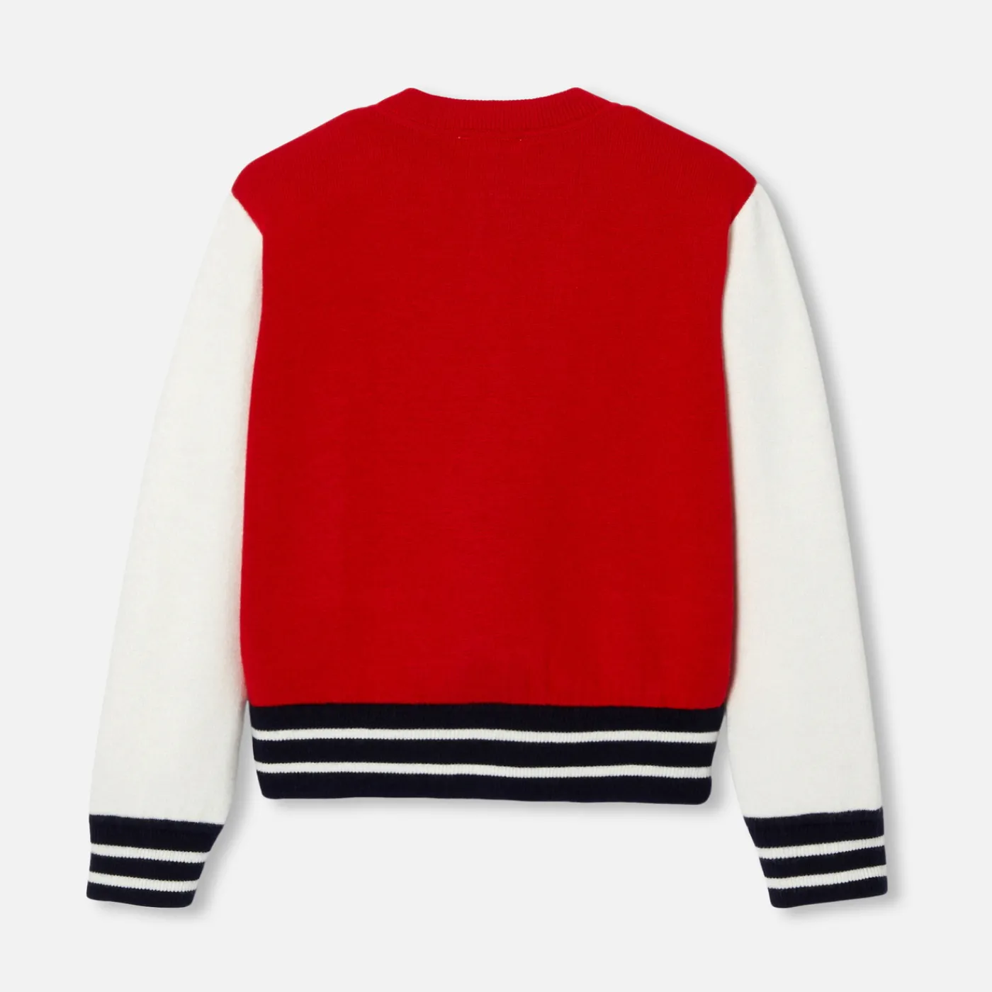 An original design for today’s little girls, the classic cardigan takes the form of a Varsity jacket for back-to-school….
