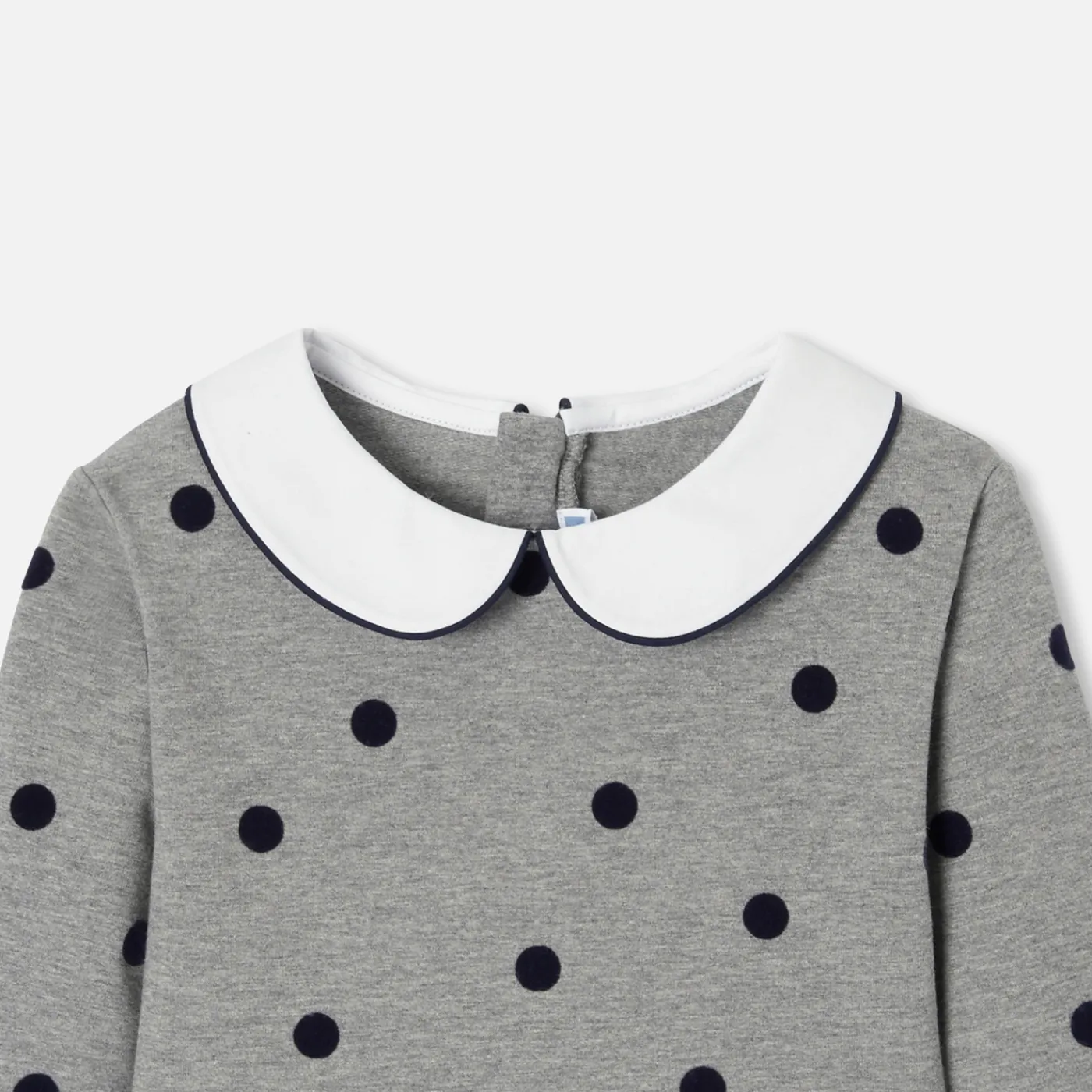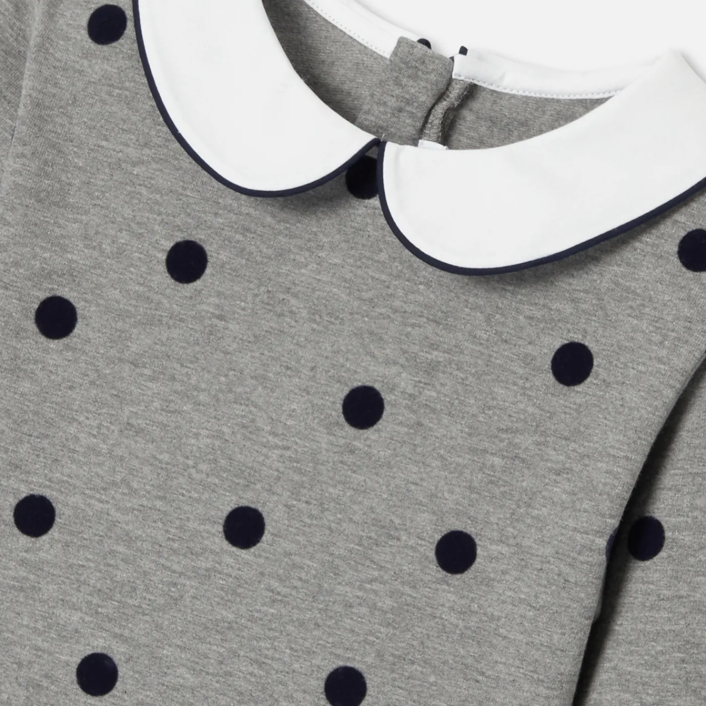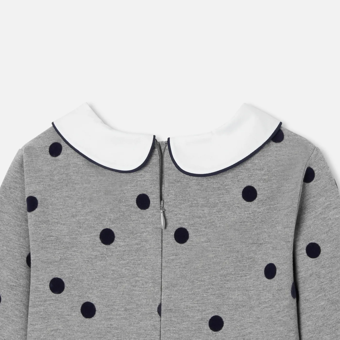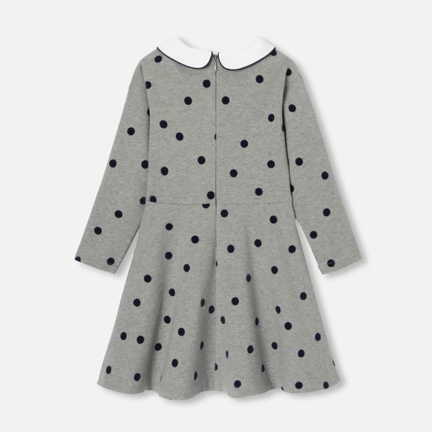A chic, cozy silhouette in this girl dress. Made from fleece flocked with navy blue polka dots, this back-to-school dres…