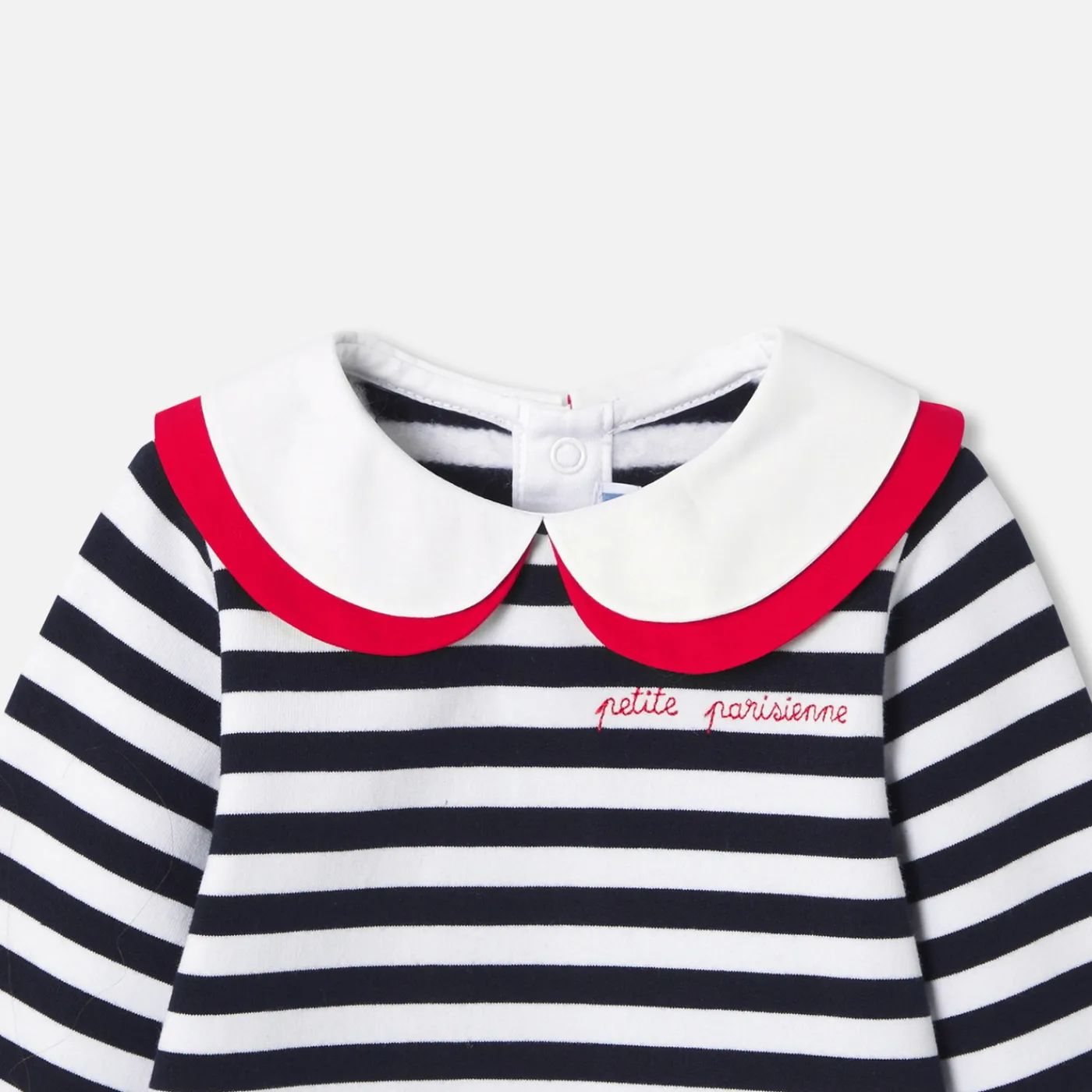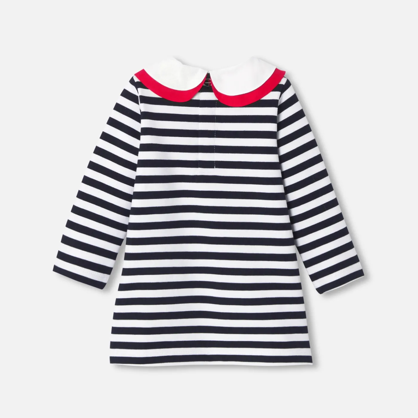 Inspired by the iconic Breton tee, this baby girl dress features a scalloped collar and embroidery. Perfect for the star…