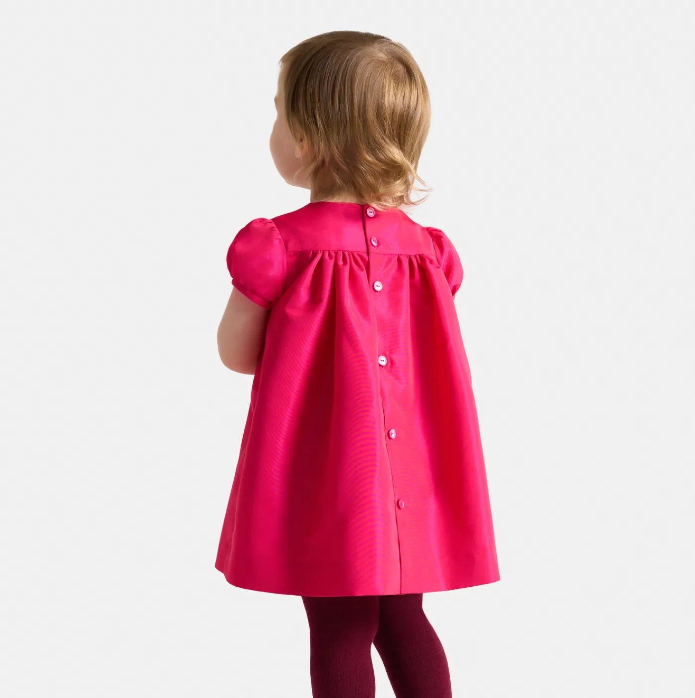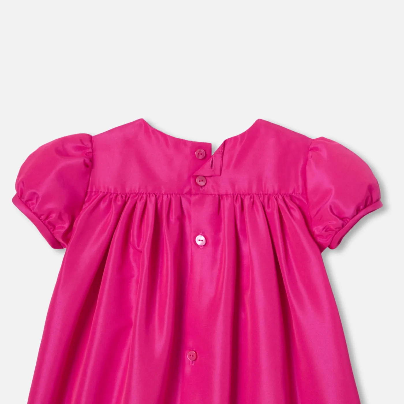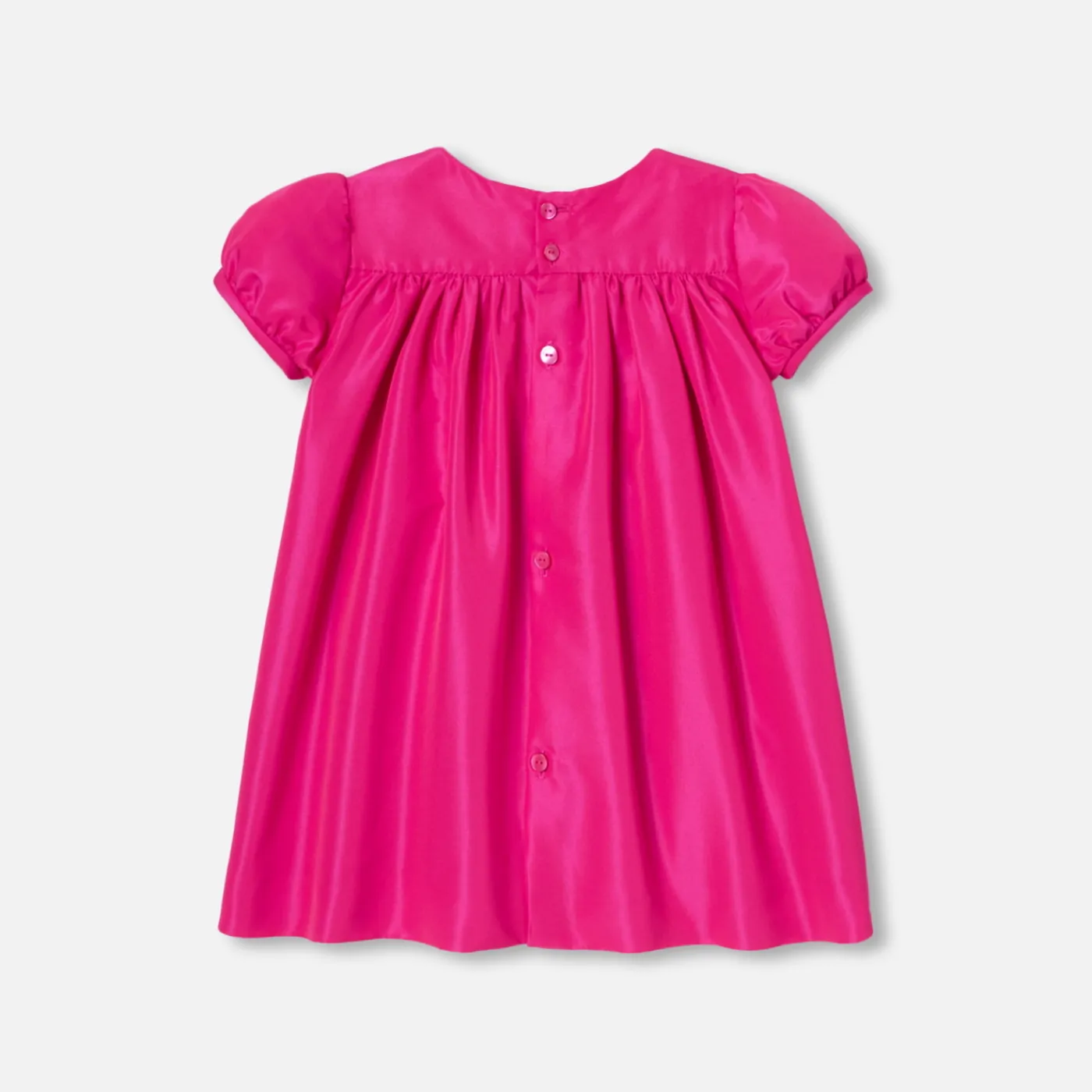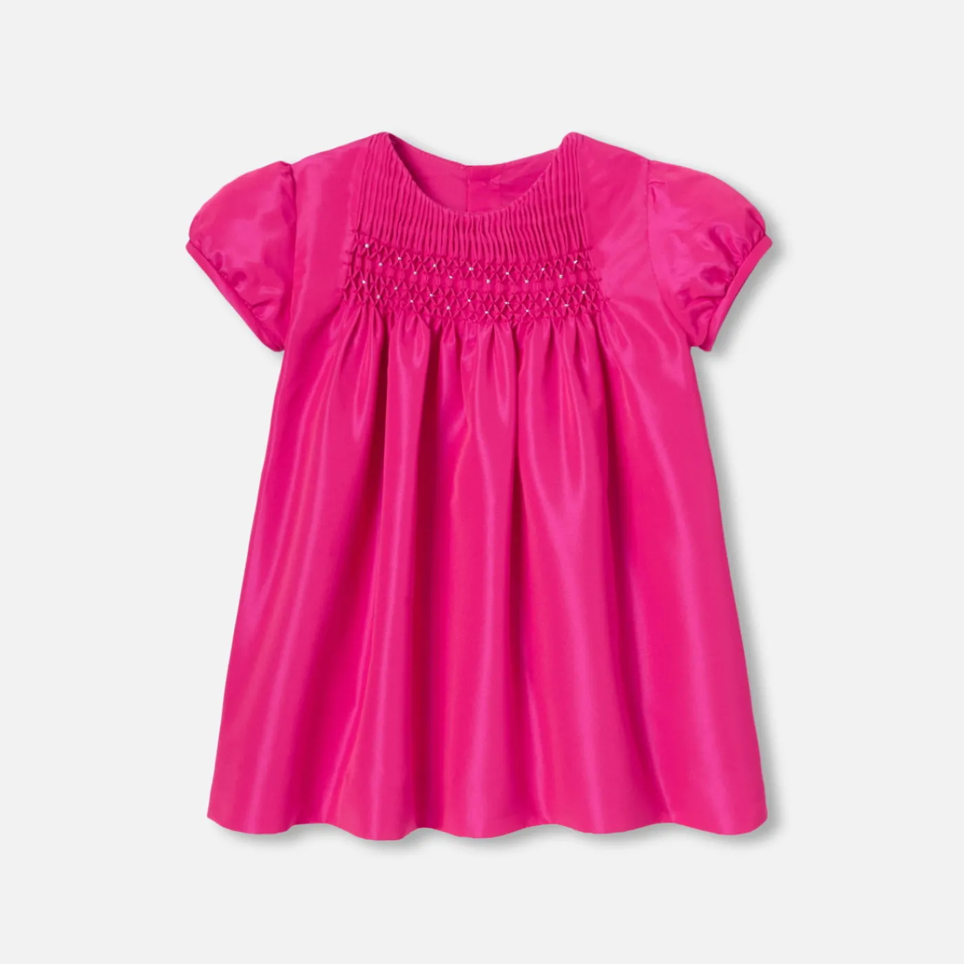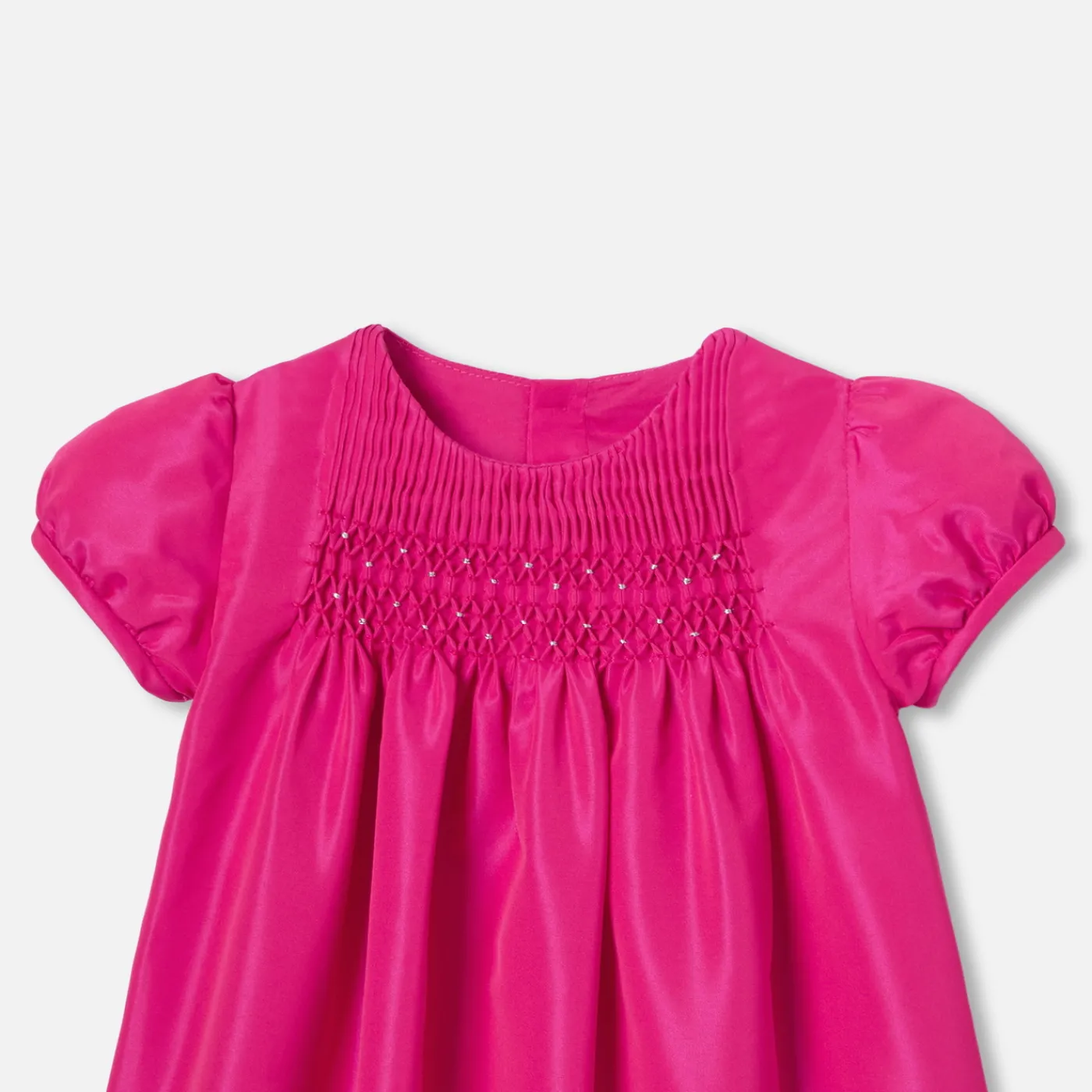 This baby girl dress is a sign of colorful elegance for the festive season. Made from taffeta, with silver smocking on t…