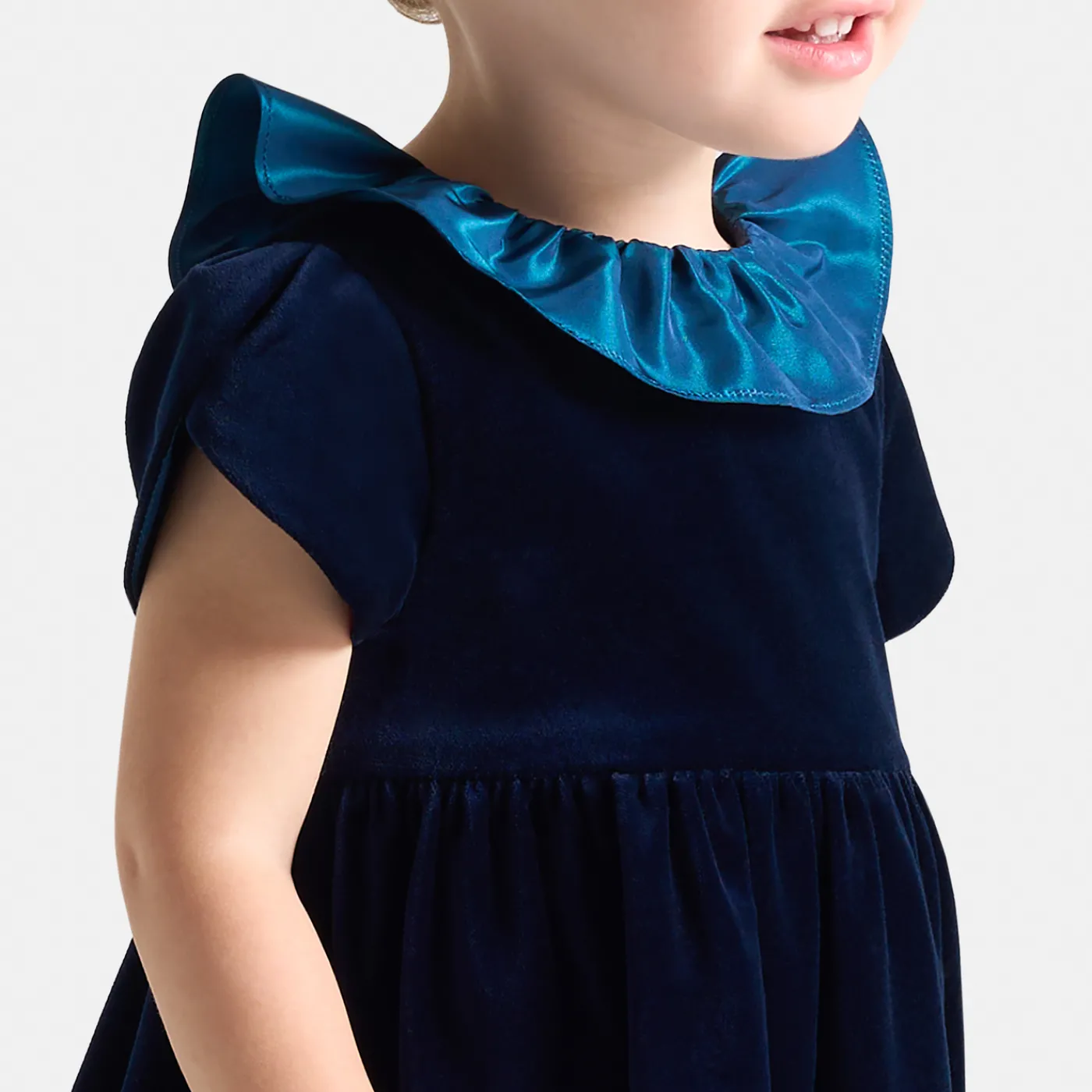 This smooth velvet dress is a piece of exception for little girls, perfect for special occasions. With a cut at the wais…