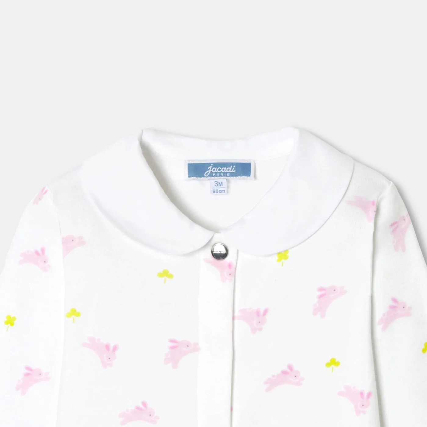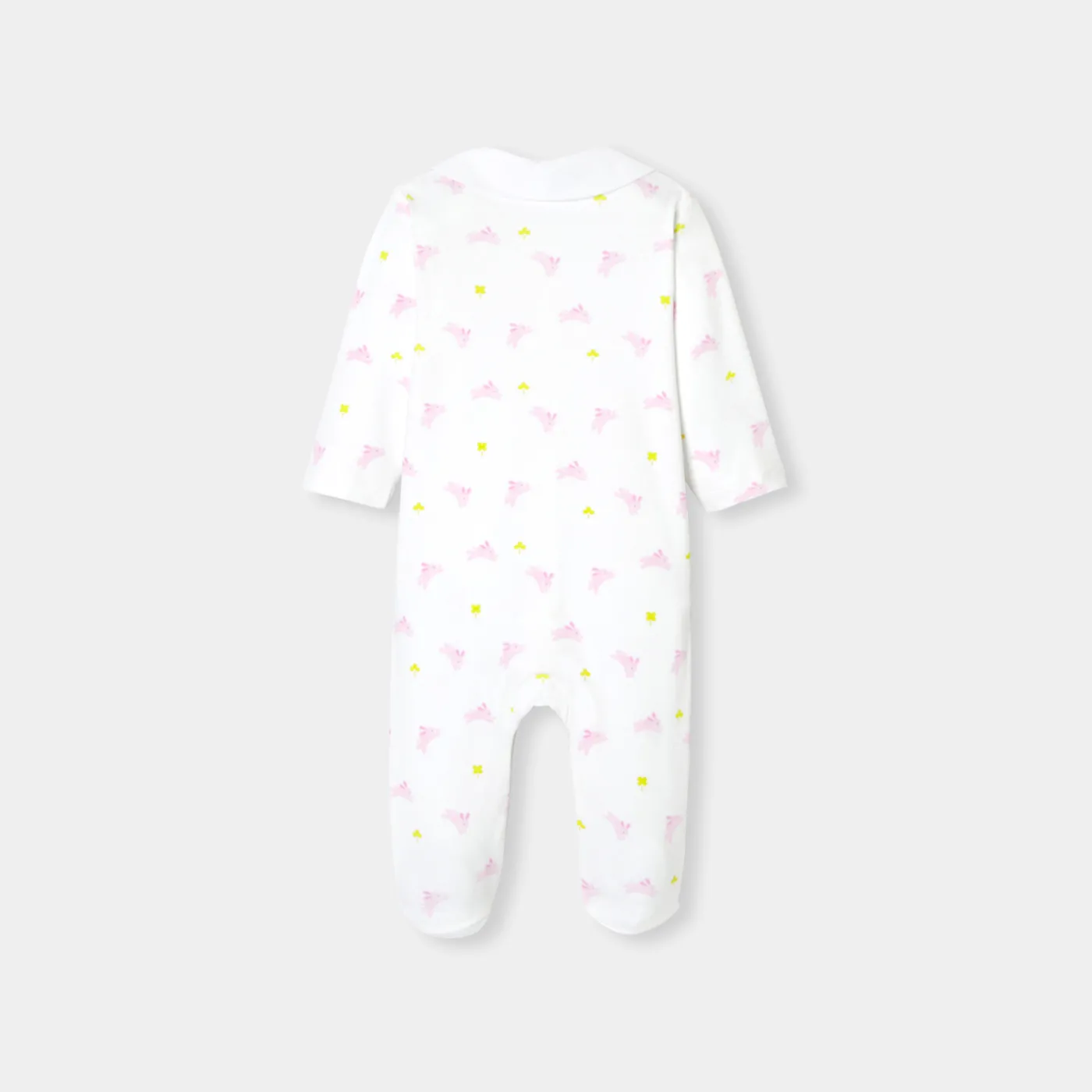 Very soft and printed with little bunnys and shamrocks, these baby girl pajamas have a very elegant poplin Peter Pan col…