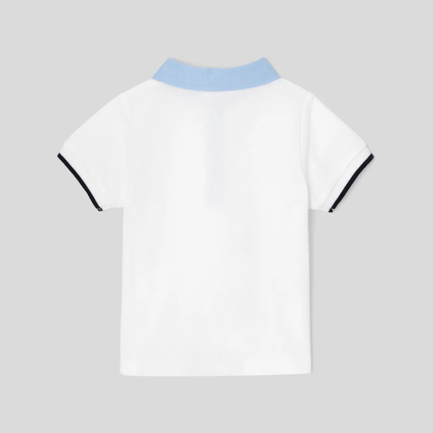 A sporty chic silhouette with this baby boy polo shirt in cotton piqué. Enhanced with an Oxford collar and striped ribb…