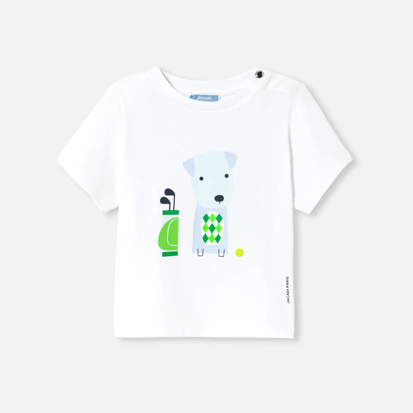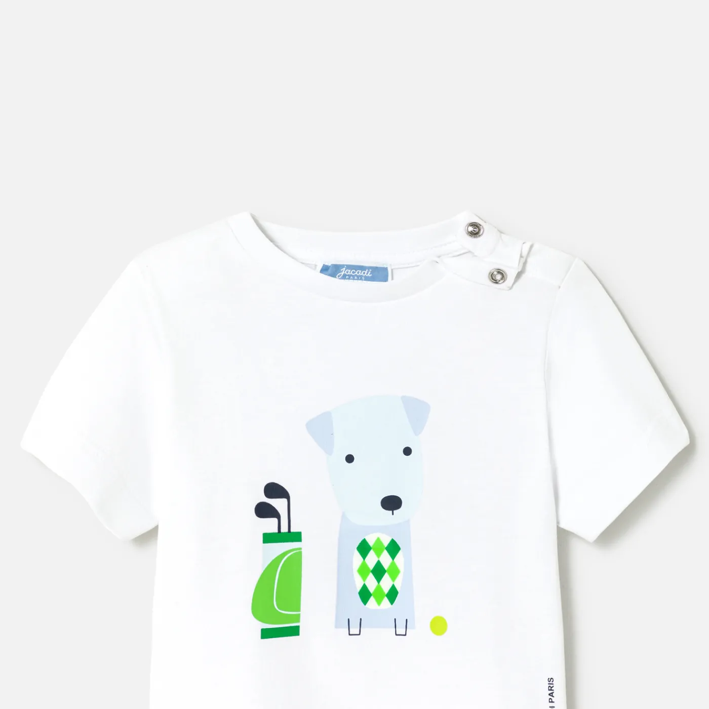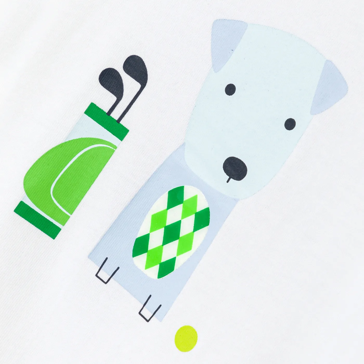 The baby boy t-shirt invites us to a game of golf at the end of summer. Printed with a dog golfer, match this wardrobe e…