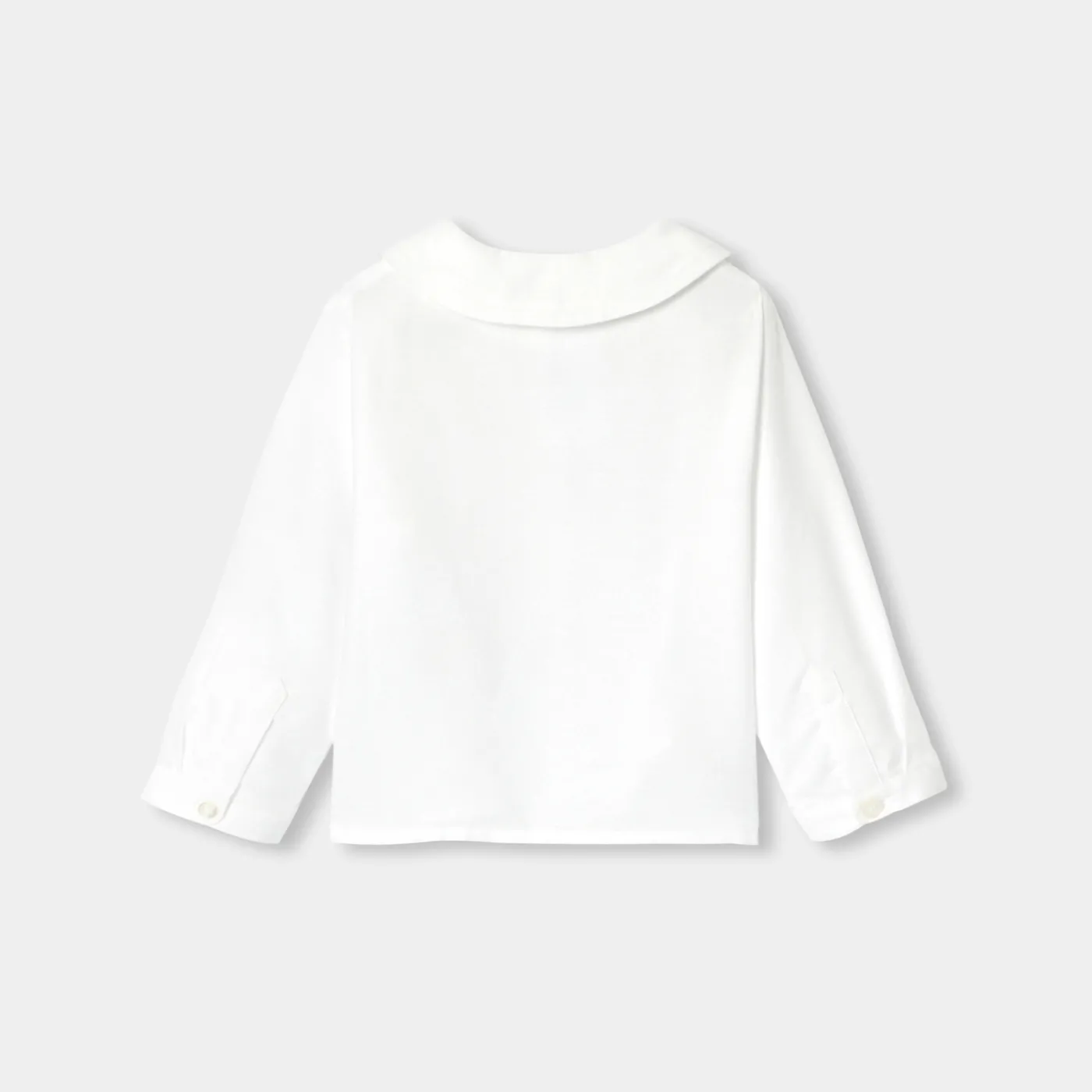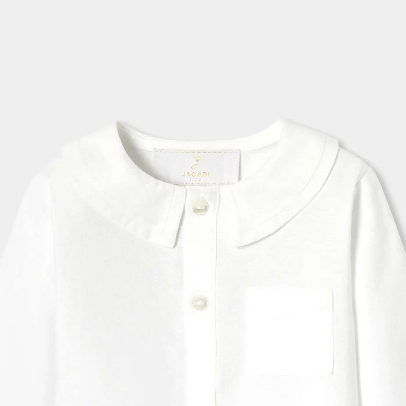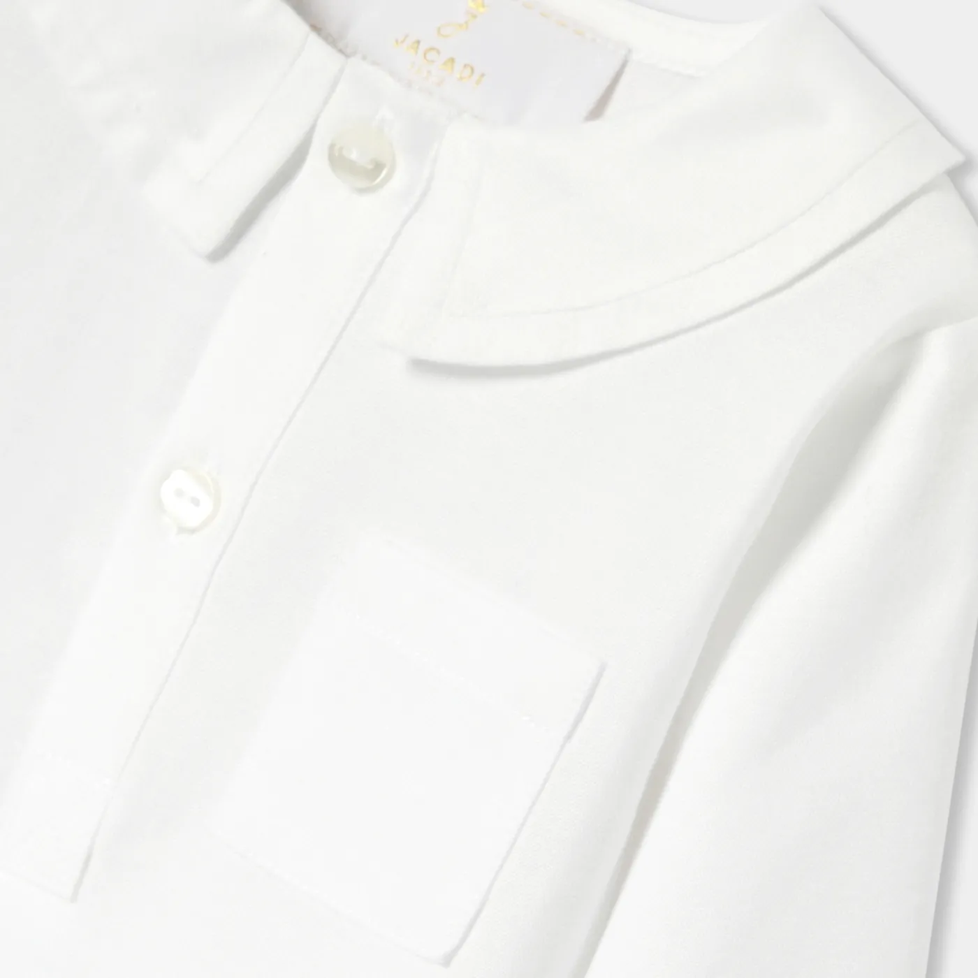 A chic, minimalist formal outfit with this baby boy shirt. The guimpe look, small collar, button fastening and front ple…