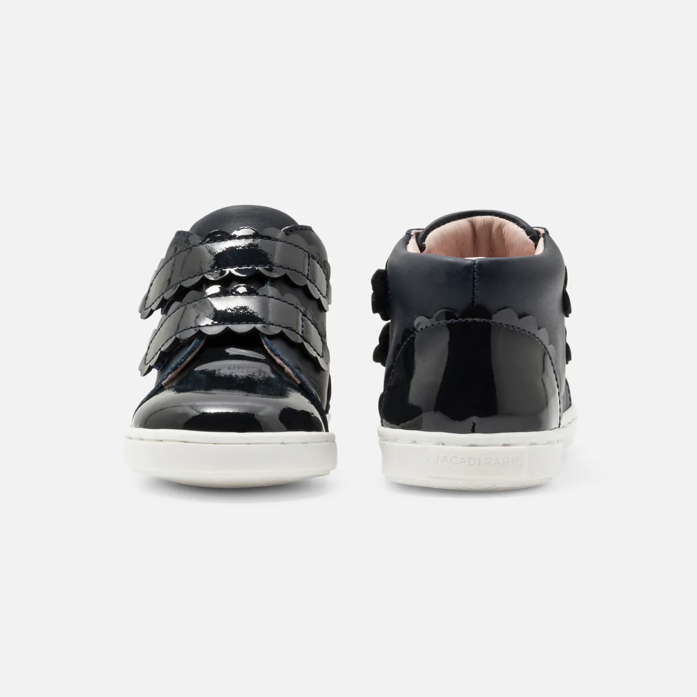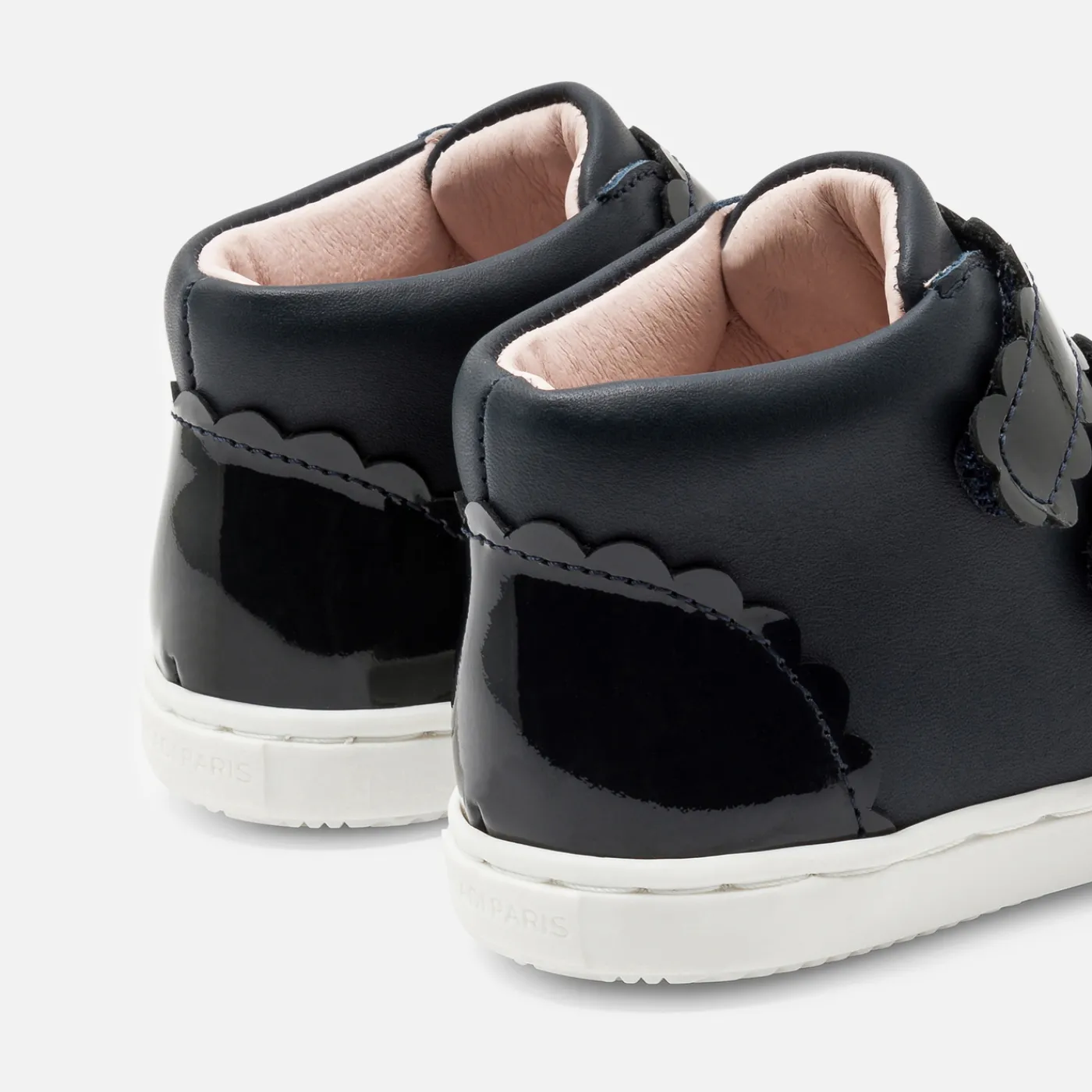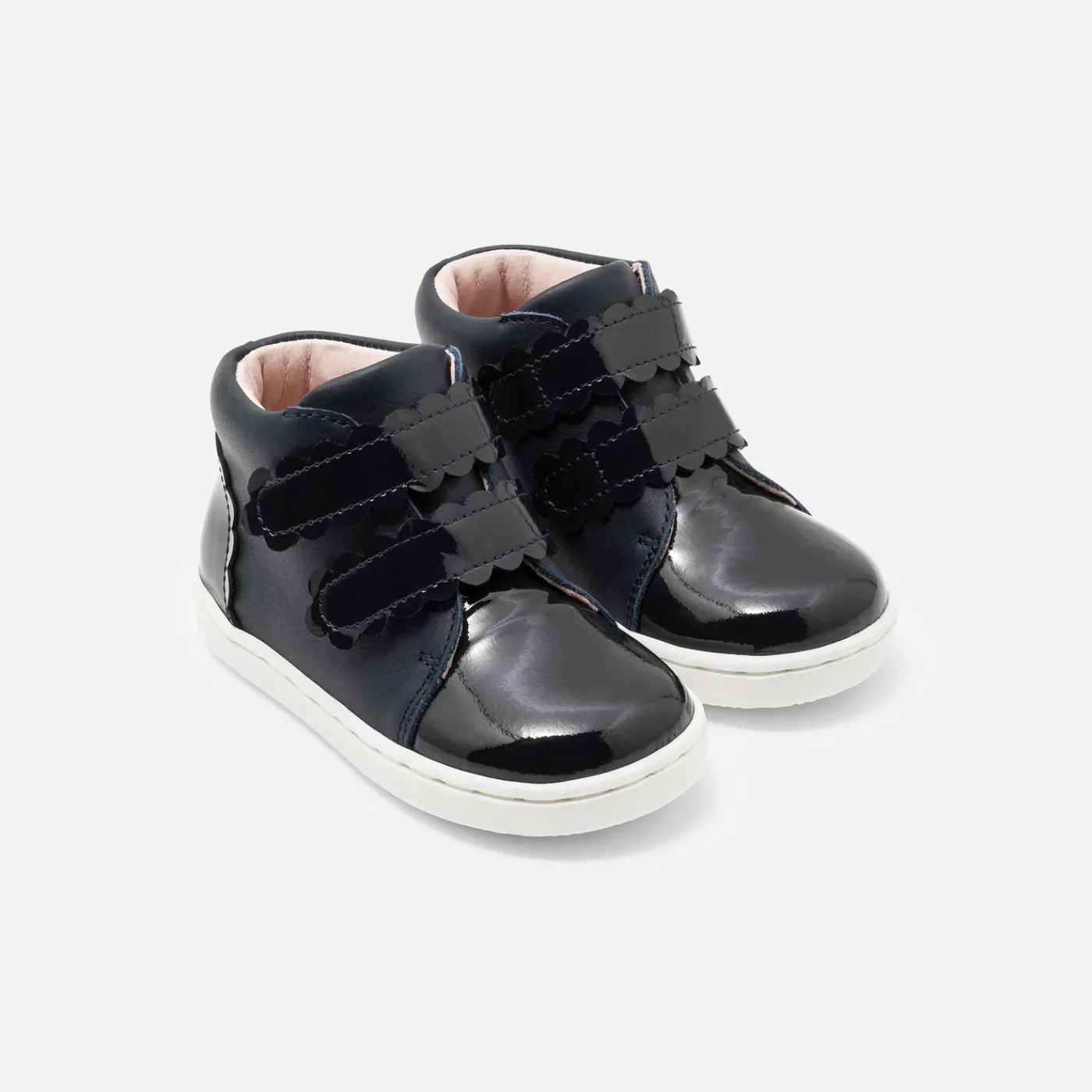 These new baby girl high-top sneakers are perfect for a chic, casual back-to-school look. Smooth or iridescent leather for a more contemporary look, scalloped details and a contrasting sole finish off these sneakers, which are easy to slip on thanks to their wide opening and Velcro straps.